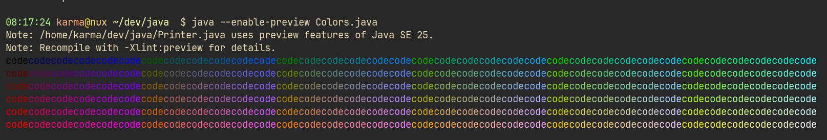 And then I could run a Java25 application (with some features still in preview - see below) - Colors.java which is using implicitely declared classes: