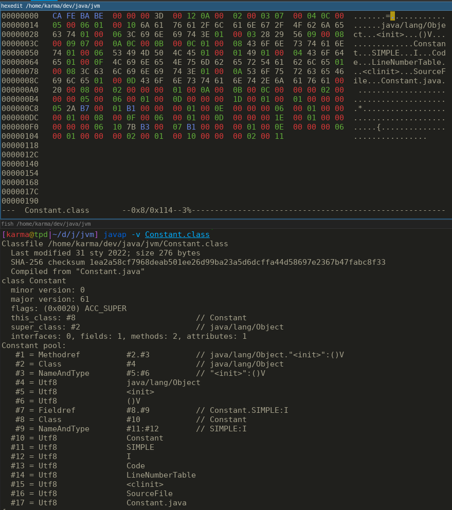 Here’s the .class contents in hexedit and constants reported by javap: /en/posts/jvm-spec/chapter_4_constant_pool/hexedit_and_constants.png