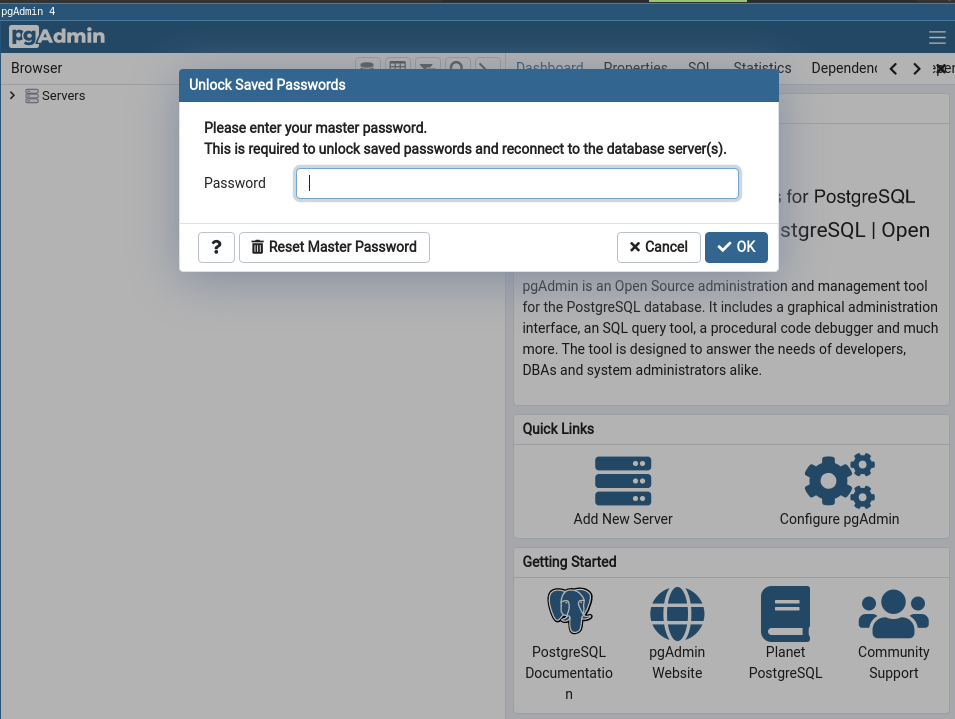 Pgadmin asks for master password so that it can use it to encrypt database credentials and not store them on disk.