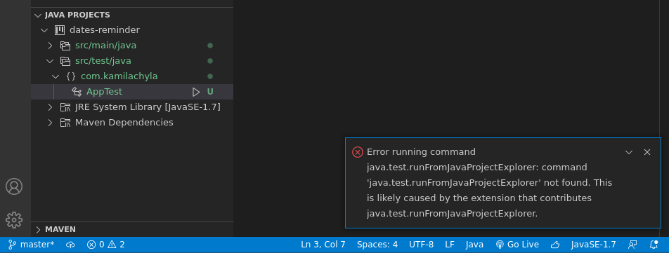 “Java: run tests” z command palette wyświetla błąd: