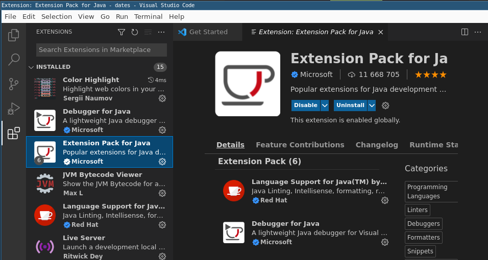 Zainstalowałam więc pakiet “Java Extension Pack”. Otrzymuję: