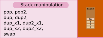 Direct manipulation of operand stack: pop, pop2, dup, dup2, dup_x1, dup2_x1, dup_x2, dup2_x2, swap