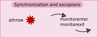 - method-level: flag ACC_SYNCHRONIZED in method_info structure (checked by method invocation instrunction); if present: thread enters monitor, calls method, exits monitor before normal/abrupt completion