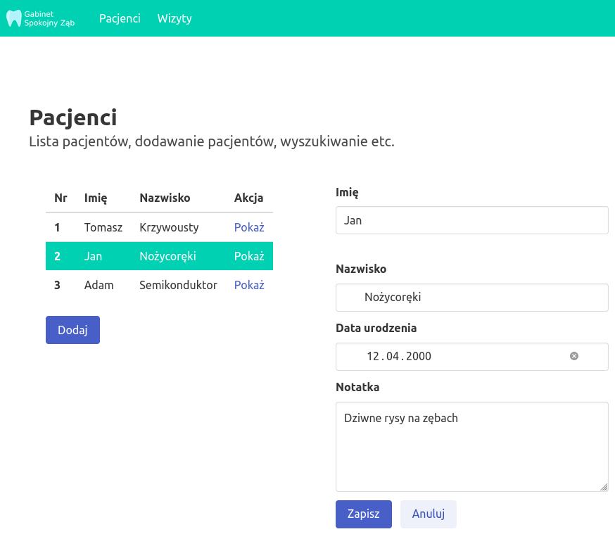 Po wielu ekperymentach z nowymi bibliotekami udało mi się stworzyć proste gui do prezentowania tabelki z pacjentami oraz formularza do dodawania oraz edycji wybranego pacjenta: